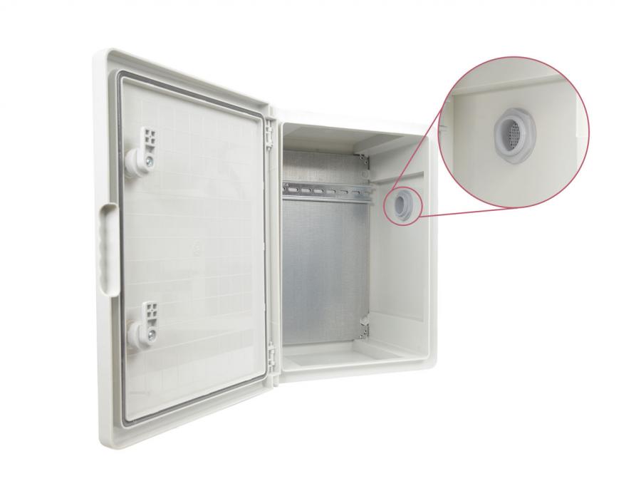 All’interno del box è presente una guida DIN regolabile, che permette di installare in modo ordinato alimentatori, protezioni elettriche, dispositivi di rete o altri componenti modulari. Inoltre è integrato un filtro di ventilazione, progettato per favorire il ricambio d’aria e ridurre la formazione di condensa all’interno del contenitore.